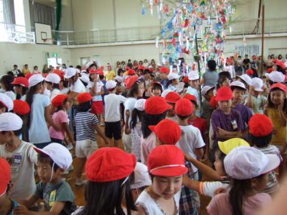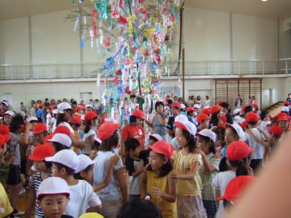 7月6日に保育園児といきいき健康クラブの方をご招待して、七夕集会を行いました。保護者の方もたくさん参観に来ていただき、盛大に行うことができました。体育館の中央には、一人一人が願い事を書いた短冊が取り付けられた笹が2本立っています。みんなは、どんな願い事を書いたのかな? 叶うといいね。