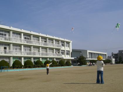 1年生が、今日の3時間目に図工の時間に作った凧を上げました。思い思いの絵を描いた凧は風になびきながらぐんぐん空高く上がりました。今の子どもたちにとっては、貴重な体験でした。